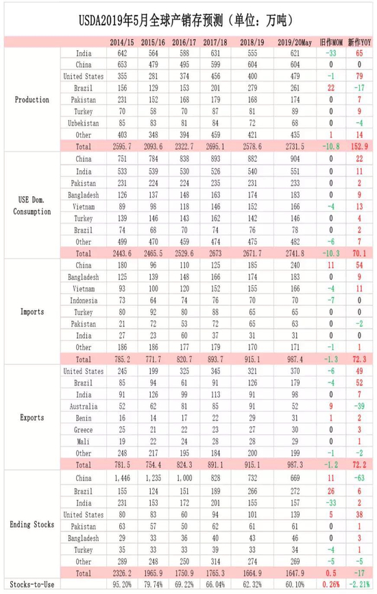 2019/20年度全球棉花预期产量增幅亮眼,同比调增153万吨,全球产需基本平衡,产需缺口仅17万吨。与2月19日农业展望论坛数据对比,我们发现,USDA5月报告对2019/20年度供需预期较农展趋紧,产需缺口17万吨(农展预期产大于需22万吨)。在消费端,USDA5月月报在农展报告的基础上调高全球消费量,对未来消费增速信心有所转好。