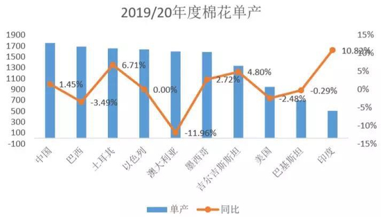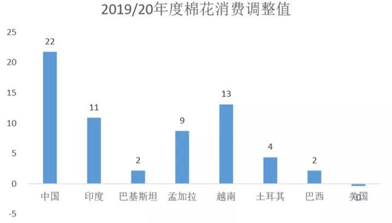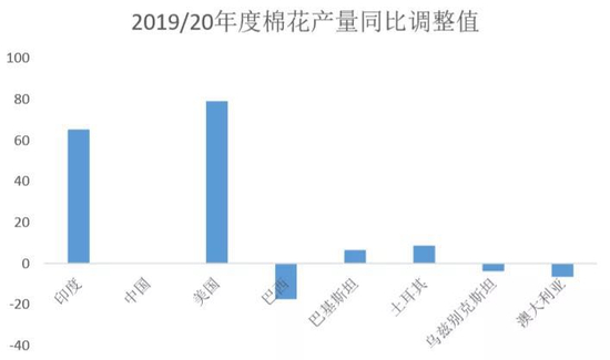 供应端来看,2019/20年度全球棉花预期产量前七的国家依次为印度、中国、美国、巴西、巴基斯坦、土耳其和乌兹别克斯坦,共占全球棉花产量的86%。产量同比调整幅度较大的国家有美国、印度、巴西、土耳其、巴基斯坦和澳大利亚,调整值分别为+79万吨、+65万吨、-17万吨、+9万吨、+6.5万吨和-6.5万吨。