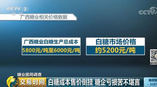 亏损,是目前广西制糖企业存在的普遍现象,而造成亏损的原因,是白糖市场价格与成本长期倒挂。广西糖业集团总工程师马步给记者算了一笔账,广西糖业的生产总成本在5800到6000元/吨之间,但目前白糖市场价格仅为5200元/吨左右,价格倒挂严重。