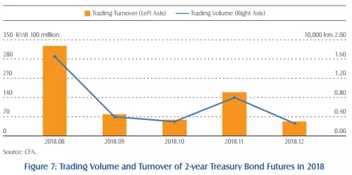 The cumulative trading volume and turnover of China‘s financial futures market totaled 27 million lots and RMB26.12 trillion in 2018, a year-on-year increase of 10.63% and 6.22%, respectively. As for stock index futures, CSI 300 Index Futures saw a trading volume of 7.4868 million lots and a turnover of RMB7.83 trillion, respectively increasing by 82.56% and 73.59% on year-on-year basis; SSE 50 Index Futures, a trading volume of 4.5173 million lots and a turnover of RMB3.52 trillion, respectively increasing by 84.86% and 85.45% on year-on-year basis; and CSI 500 Index Futures, a trading volume of 4.3402 million lots and a turnover of RMB0.439 billion, respectively increasing by 32.39% and 7.10% on year-on-year basis (Figure 5). Among Treasury Bond Futures, 5-year Treasury Bond Futures recorded a trading volume of 1.843 million lots and a turnover of RMB1.80 trillion, respectively decreasing by 34.68% and 34.72% on year-on-year basis; 10-year Treasury Bond Futures, a trading volume of 8.9887 million lots and a turnover of RMB8.52 trillion, respectively decreasing by 24.77% and 24.84% on year-on-year basis (Figure 6); and 2-year Treasury Bond Futures, a trading volume of 34.1 thousand lots and a turnover of RMB67.835 billion since its listing on August 2018 (Figure 7).