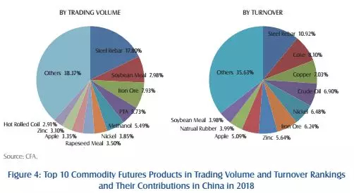 In 2018, the cumulative trading volume of China‘s commodity futures market totaled 2.983 billion lots, a year-on-year decrease of 2.07%, with a turnover of RMB184.68 trillion, a year-on-year increase of 13.09%. The trading volume and turnover of commodity futures contracts in China in 2018 are shown in Figure 3. Among them, the top 10 products in trading volume rankings include Steel Rebar, Soybean Meal, Iron Ore, PTA, Methanol, Nickel, Rapeseed Meal, Apple, Zinc and Hot Rolled Coil, totaling a trading volume of 1.839 billion lots, accounting for 61.63% of the total commodity futures trading volume (Left, Figure 4). And the top 10 products in turnover rankings are Steel Rebar, Coke, Copper, Crude Oil, Nickel, Iron Ore, Zinc, Apple, Natural Rubber and Soybean Meal, contributing a turnover of RMB118.88 trillion, accounting for 64.37% of the total commodity futures turnover (Right, Figure 4).