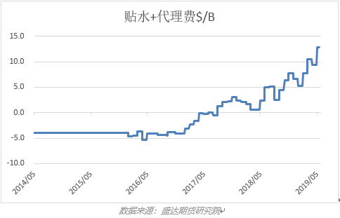 以马瑞原油为例,升贴水+代理费在2016年1月前都是-4$/B的常数,随后最低达到-5.3$/B,从17年起上涨趋势明显,17年5月上涨至-0.2$/B,最新19年5月的12.9$/B是截止目前的最新价位。升贴水+代理费月度调整幅度越来越大,且与轻重油价差的相关关系有所减弱,预测升贴水+代理费变化难度堪比预测短期原油价格变化难度,类比我们将短期原油价格分为高中低三挡的思路(例如目前WTI分别对应70$/B、60$/B、 50$/B),我们也可以将升贴水+代理费分为高中低三挡来考虑对应比价的操作。