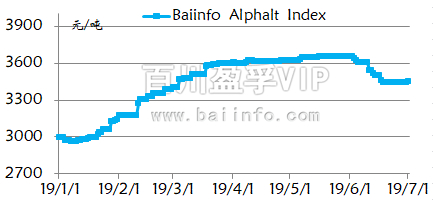 经历2018年12月大跌之后,从2019年1月份开始,随着原油价格止跌上涨,带动国内沥青市场一路上行,百川沥青价格指数从1月初的3173元/吨,涨至5月底的3652元/吨,涨幅达479元/吨或15%,同比每月涨幅维持在550-850元/吨左右。但5月中下旬之后,沥青市场开始下行趋势,进入6月市场全面走低,带动沥青价格指数下跌。整体来看,上半年国内沥青价格呈现大幅上行走势,截止到7月1日,百川沥青价格指数由年初的3173元/吨,上涨至3450元/吨,涨幅达277元/吨或8%。