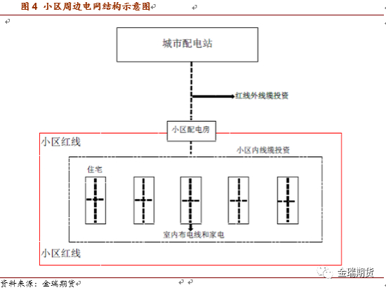 房地产用铜基本上都和电线电缆有关,但市场上对于房地产中具体什么工程涉及到铜消费仍然不够清楚,从房地产电网的结构上进行梳理可以更好的理解这个问题。首先,电网投资的时候会规划好城市的配电网络,城市之中设立了不同的变电站供房地产电源接入。房地产开发的时候,需要从城市配电网接入电源至小区红线内,这一部分是由房地产公司付费,交由电网公司施工的。城市配电网接入小区内的配电房之后,小区内再进行管线铺设,包括小区和建筑内部的线网,其中涉及到的用铜地方主要包括供电、消防和景观工程。小区内的线连接到每户门口的电表后,再引入每户的房间内部,铺设成布电线,最终连接终端电器。