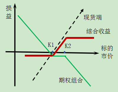 已知该企业在现货上存在多头敞口,同时在场外衍生品市场卖出看涨期权与现货头寸可构建成备兑组合,在这里看涨期权并不能完全规避PTA价格下跌导致现货端销售收入降低的风险,只能通过收取权利金降低部分损失,而在PTA市场价格上涨时现货端可获得销售收入增加的收益,但卖出看涨期权将随着PTA价格的上涨产生亏损,从理论上来说组合整体的亏损有限。由于该企业可利用其信用额度来取代部分甚至全部卖出期权的保证金,这大大降低了企业的资金占用,但也增加了业务的风险。组合的到期损益图如下,在PTA价格下跌时仍存在风险敞口,可见卖出期权策略并不能作为企业规避风险的单独使用。