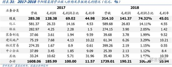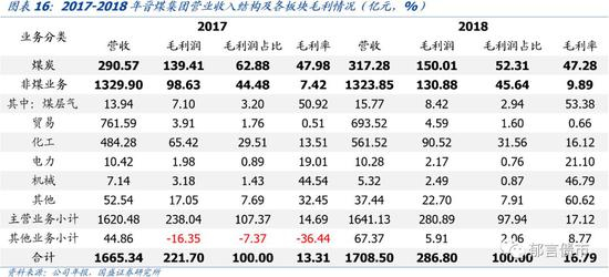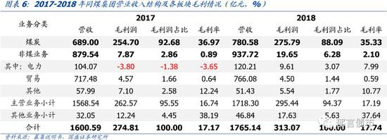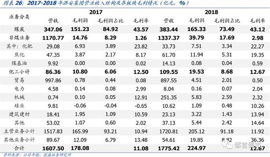非煤业务以化工业务为主,涉及领域较为分散,盈利能力不强。2017-2018年,非煤业务毛利率有所上升但仍然较低,2018年为2.98%。非煤业务以化工业务为主,此外还包括贸易、电力、机械、光伏、建筑建材等,涉及领域较为分散。2018年,化工业务营业收入由2016年增长76.81%至109.55亿元,营业收入占比由3.87%增长至6.17%,规模扩张较快。