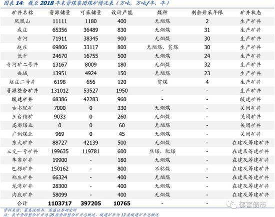 煤炭资源较为分散,煤种齐全,矿井资源整合较多。晋能集团煤炭资源遍布全省六大煤田,煤种涵盖全部14类国标分类煤种。煤种分布上,长治、晋城、阳泉区域以无烟煤为主,临汾、吕梁以焦煤为主,山西北部区域以动力煤为主。截至2019年3月底,晋能集团拥有154座矿井,井田面积1293平方公里,年生产能力14205万吨/年,资源储量118亿吨,全部为下属全资子公司煤销集团在煤炭资源整合过程中获得。