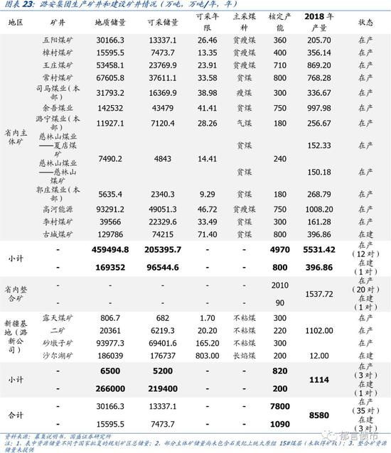 煤炭资源跨省分布。潞安集团煤炭资源主要分布在沁水煤田东部边缘中段,在新疆拥有一座主产高发热量不粘煤的优质动力煤煤矿,目前已形成潞安本部、武夏、忻州、临汾、晋中、潞安新疆六大矿区,煤炭总储量达到435.6亿吨。同时,为扩大基础资源储备,集团预计还将在内蒙古整合88亿吨煤炭资源。目前集团在山西和新疆合计拥有47座矿井,本部矿区规划总面积2279平方公里,年生产能力1.011亿吨,资源储量195.48亿吨。以优质动力煤、喷吹用煤、炼焦配煤及化工用煤为主,主要煤种包括瘦煤、贫瘦煤、贫煤和不粘煤。