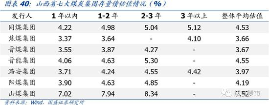 从存量债估值看,焦煤集团和晋煤集团估值水平较低,2年以内存量债估值均低于4%,整体平均估值低于3.7%。而山煤集团估值较高,各期限存量债估值均高于7%,整体平均估值为7.52%。潞安集团整体平均估值在4%左右,阳煤集团、晋能集团和同煤集团整体平均估值在4.2%-4.5%左右。