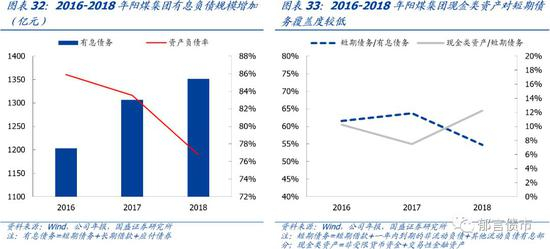 债务方面,有息负债规模扩张较快,短期偿债能力最弱。近三年阳煤集团有息债务规模由1203.50亿元上升12.30%至1351.58亿元。从短期偿债能力看,2018年现金类资产/短期债务仅12.24%,在7家煤企中排名垫底。