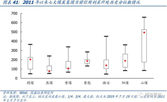 我们选取2011年1月7日至2019年7月19日为历史区间,剔除永续债、剩余期限半年以内以及5年以上的债券,并采用算术平均法计算每家煤企的信用利差(债券估值减同期限国开债)。2011年以来,煤炭行业经历了产能过剩导致的煤价自高点持续下跌和去产能之后煤价逐步回升至较高水平的过程。