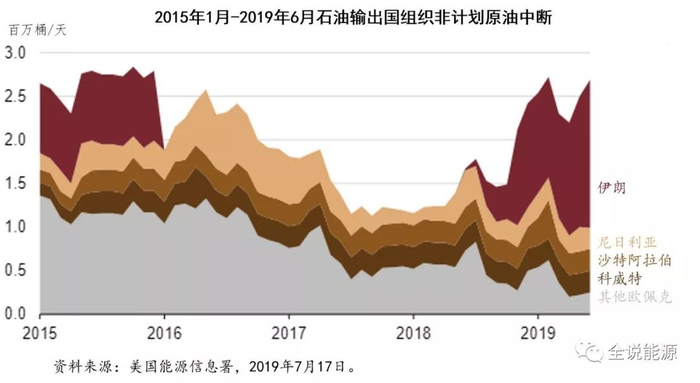 由于制裁、自然灾害和国内等多方面因素,2019年上半年,石油输出国组织成员国的非计划性原油产量中断,达到日均250万桶/天,为2015年以来的最高水平。其中,2019年6月,伊朗的非计划性原油中断为170万桶/天,占石油输出国组织总水平的60%以上。