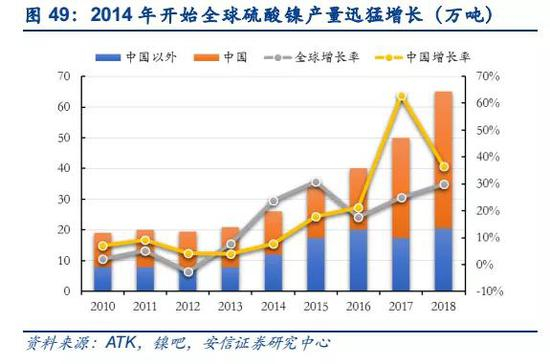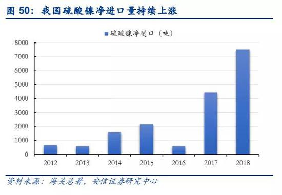 全球硫酸镍产量迅猛攀升,我国硫酸镍进口加大。据ATK数据显示,2013年及以前,全球硫酸镍的产量相对稳定,保持在20万吨上下,随着2014年之后电动汽车大幅增长,硫酸镍产量持续攀升,2018年全球硫酸镍产量达到约65万吨,近4年年均增长率超过20%,其中,中国硫酸镍产量达到约45万吨,同比增长近40%,占全球产量达到约68%。据海关数据显示,2017年开始我国硫酸镍开始大量进口,2018年,我国净进口硫酸镍7,511吨,同比增长70%。
