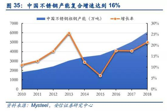 中国是全球最大不锈钢生产国和消费国,不锈钢产能高速增长势必带动镍的需求增加。随着中国经济的快速发展和人民生活水平的不断提高促进了国内不锈钢产品的消费和需求,2018年,中国不锈钢产量2,670万吨,占全球不锈钢产量比例达到53%,表观消费量2,132万吨。由于不锈钢产能的不断增长,不锈钢行业对镍的需求有望持续增加。