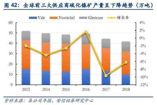 近十年来硫化镍矿鲜有新发现,硫化矿投资下滑,传统硫化矿山产量逐渐下降。全球镍矿资源相对丰富,但占比仅40%的硫化镍矿已经开发上百年,长期的开采后,硫化镍矿的资源储量、开采条件、矿石品位等方面都逐渐变差,加上近年来未有新的硫化矿发现,硫化矿的投资在下滑,传统的矿山的产量已经开始加速下降。传统硫化镍矿的主产国为俄罗斯、加拿大和澳大利亚等,2018年产量分别为21万吨、16万吨和17万吨,同比分别下降1%、24%和9%;全球前三大镍供应商Vale、Nornickel和Glencore三家公司的硫化镍矿山生产产量都出现明显的下降趋势,2018年合计镍产量约41.8万吨,同比下降近6%。