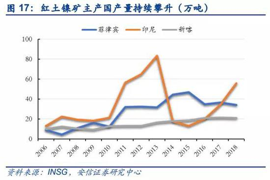 红土镍矿生产镍铁工艺促使红土镍矿产量持续上升。不锈钢的需求刺激促使大家将目光从硫化镍矿转向资源更丰富的红土镍矿,红土镍矿生产镍铁工艺大规模应用后,红土镍矿产量持续增长,成为全球镍的主要供应来源。2018年,印尼、菲律宾和新喀三大主产国的产量分别为56万吨、34万吨和21万吨,同比分别上涨62%、-7%和-2%,整体呈上升趋势。