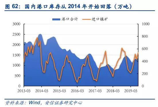 从国内镍铁原料供给端,一是港口库存。据我的有色统计,目前港口库存约1300万吨,按照累积速度,考虑印尼和菲律宾进口加速,2019年9-12月可将库存累积至1900万吨,折合镍金属约19万吨,接近2014年峰值。二是菲律宾及其他国家进口镍矿。2018年,中国从菲律宾进口矿石量约3001万吨,2019年1-7月进口1429万吨,同比增长约5%,假设2020年菲律宾进口增长10%,2020年进口3300万吨镍矿,几乎达到历史最高水平,折合镍金属约33万吨。其他国家2018年进口约197万吨镍矿,2019年1-7月进口107万吨,假设2020年进口增加50%,进口约300万吨,折合镍金属3万吨。故全年进口合计可达36万吨镍矿(金属量),月均3万吨镍金属进口量。