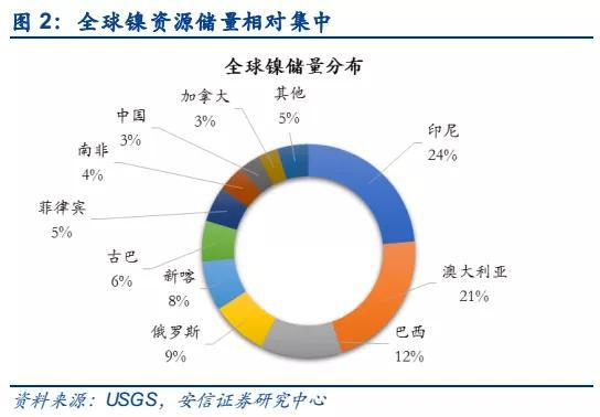 全球镍储量相对集中,前十国储量占比达95%。近年来全球镍矿储量增长趋缓,据美国地质调查局(USGS)数据显示,2018年全球镍资源量超过1.3亿吨,镍储量为8,900万吨。由于近年来不锈钢对镍需求的增长,印尼的镍矿投资加大,2018年储量同比大幅增长,成为镍资源最丰富的国家,储量2,100万吨,约占全球储量的24%,其次是澳大利亚、巴西、俄罗斯、新喀、古巴、菲律宾等国。中国是贫镍国,储量约280万吨,主要集中在金川镍矿,占比约为3%。