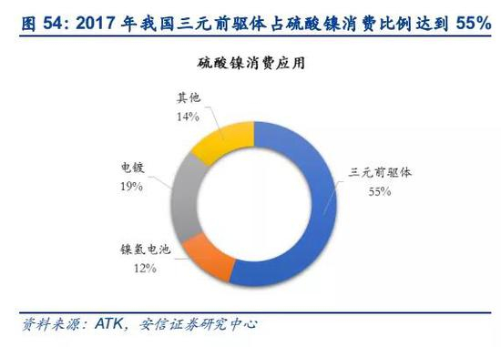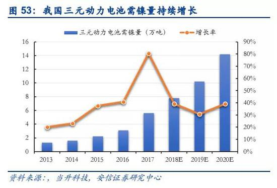 硫酸镍消费应用主要集中在电池领域,是制备动力电池三元前驱体的核心原料。三元动力电池前驱体主要包括镍钴锰三元和镍钴铝三元,镍元素的原料主要采用硫酸镍,2018年,我国三元前驱体占硫酸镍消费比例超过50%,达到约6万吨的规模,近三年的年均增速近20%。叠加高镍811型动力电池的渗透率逐渐提高,2019年三元动力电池正极材料用镍量有望达到10万吨金属量规模,预计未来有望持续保持较高增长,2020年镍需求量有望超过15万吨金属量。