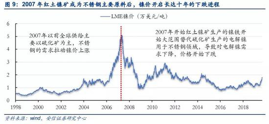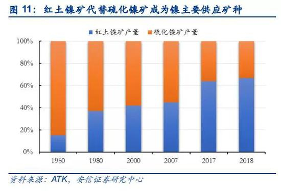 红土镍矿生产的镍铁替代电解镍成为不锈钢主要原料来源,电解镍需求减弱,导致镍价自2007年开启十年下跌趋势。全球陆基镍矿储量中,60%的镍是以红土镍矿的形式存在,主要分布在赤道附近的古巴、新喀、印尼、菲律宾、缅甸、越南、巴西等国;40%是以硫化镍矿的形式存在,主要分布在加拿大、俄罗斯、澳大利亚、中国和南非等国。在2007年以前,硫化镍矿是全球镍供给的主要来源,不锈钢生产所需的镍主要以电解镍为原料。从2007年开始,随着镍价率创历史新高,导致不锈钢的成本随之不断上升,而红土镍矿生产的镍铁对于不锈钢来说经济效益显著,不锈钢的高需求以及高镍价推动镍铁生产不锈钢工艺快速大规模发展,从而导致不锈钢产业对电解镍的需求迅速减少,造成电解镍持续过剩,镍价开启下跌进程。到2018年,全球红土镍矿供给占比从10年前的45%提高至67%左右,替代硫化镍矿成为镍下游应用的主要应用原料来源。