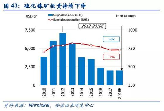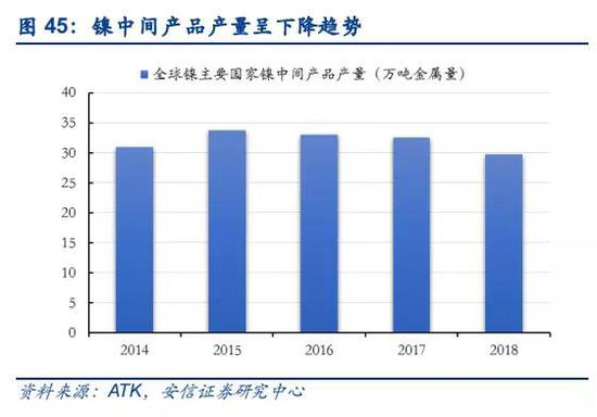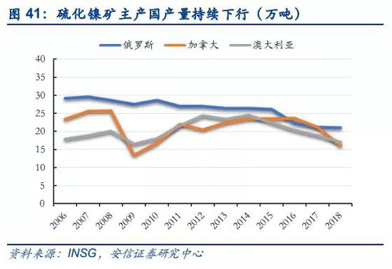 ■硫化镍矿勘探未有突破,传统矿山资源禀赋变差,供给维持收缩态势。全球储量占比40%的硫化镍矿已开发上百年,长期开采导致硫化镍矿资源储量、开采条件、矿石品位等方面逐渐下降,加上近年来鲜有新的硫化矿发现,传统矿山的产量呈现不断下降趋势。2018年,传统硫化镍矿的主产国俄罗斯、加拿大和澳大利亚产量分别为21万吨、16万吨和17万吨,同比分别下降1%、24%和9%。