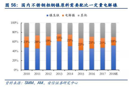 全球精炼镍中仅约19%供给适合硫酸镍的生产,中国硫酸镍大部分采用镍中间产品生产。全球200多万吨镍产量当中,镍铁消费占比超过50%,这部分短期无法大规模作为硫酸镍的生产原料,剩下约100万吨精炼镍中约39万吨是最适合的原料,其中镍豆等可以通过溶解生产硫酸镍,而约61万吨电解镍板理论上同样可以生产硫酸镍,但是酸溶速度较慢,不及镍豆酸溶速度的1/10,时间成本过高。据上海有色网数据显示,2017年,中国硫酸镍原料中约55%来自镍中间产品,随着需求的增大,硫酸镍扩张方式一方面可直接转向采用电解镍溶解方式生产,另一方面可实施电解镍产能改造向硫酸镍产能转变。