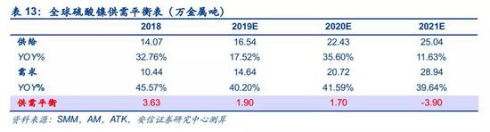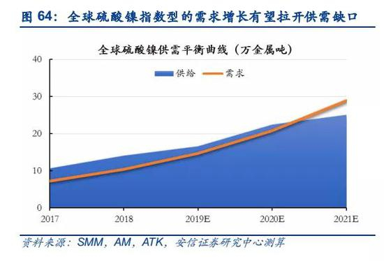 ■新能源汽车产业的兴起有望打开镍的需求空间,开启镍产业新时代。镍铁替代电解镍成为不锈钢主要原料后,镍价进入长达十年的下跌周期,而新能源汽车产业近年来高速发展,三元动力电池对硫酸镍的需求有望重新打开镍的需求上升空间,驱动镍价重回上行通道,进入新的供需和价格周期。预计2019-2021年全球镍持续短缺并且缺口逐渐扩大,分别达到10万吨、11万吨、13万吨。