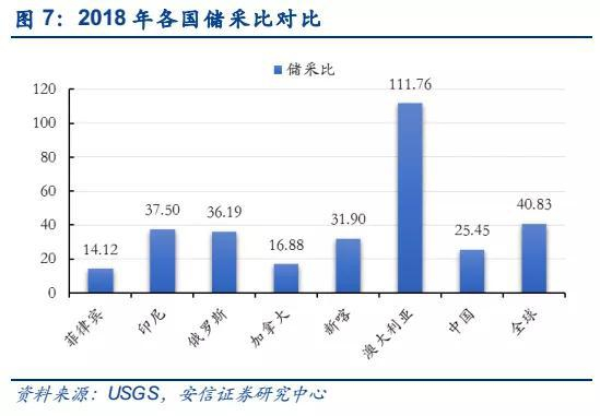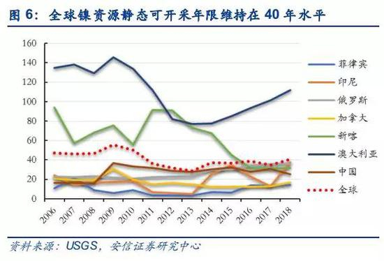 全球镍资源静态可开采年限约41年,资源较为丰富。全球镍矿储量缓慢增长,储采比中枢稍有降低,但总体仍处于40年左右水平。2018年,全球前三大产镍国印尼、菲律宾和俄罗斯的储采比分别为14、38和36,均低于平均水平。