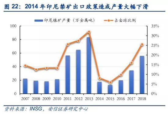 2014年1月,印尼政府看准未来不锈钢需求,开始禁止镍矿原矿出口,矿石产量大幅下降,强化国内镍下游产业链建设。印尼政府看准未来不锈钢发展,为了保护本国自然资源,同时增加矿产品出口附加值,规定2014年1月12日起禁止原矿出口,直接导致我国从印尼的镍矿进口量直线下降,从月度进口数据可以明显看到,进口量迅速趋近于0。印尼国内镍矿的产量也出现断崖式下降,从2013年83万吨减少到2014年18万吨,同比下降近80%,全球产量份额占比也从32%降低到8%。