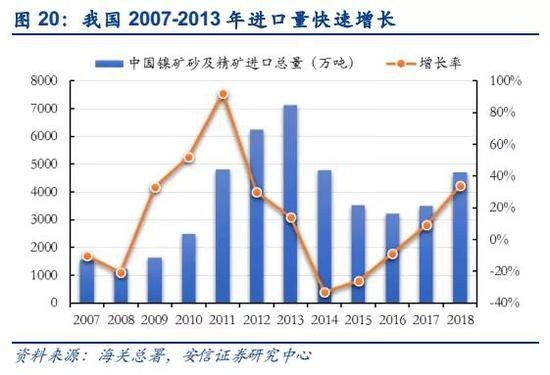 我国镍资源短缺,主要从印尼和菲律宾进口镍矿,自印尼禁止原矿出口后,进口量骤降。我国是一个贫镍国,全球储量占比仅3%,镍矿对外依存度为85%,除从国外进口硫化镍矿的产成品或镍中间产品外,原矿的进口绝大部分为红土镍矿,并且主要来自印尼和菲律宾,占比超过90%。我国在2005年左右开始采用红土镍矿进行镍铁的生产,在2007年之后开始大规模应用,并逐步加大从印尼和菲律宾的进口,2013年达到最高峰,进口镍矿石量超过7,000万吨,相比于2007年增长了358%,但随着印尼禁矿政策出台后,进口量迅速回落。
