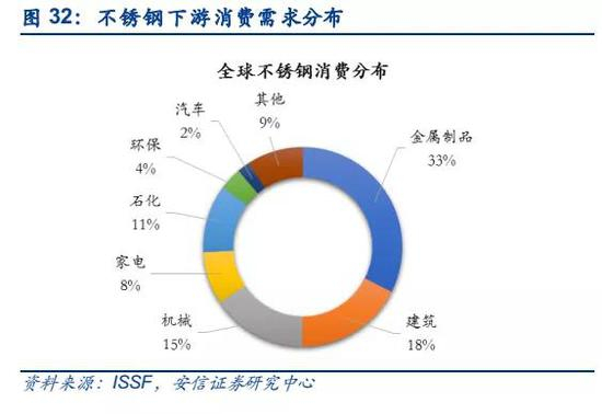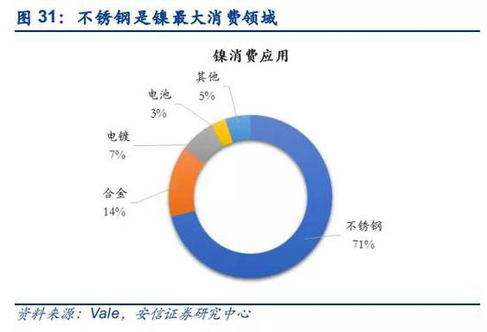 不锈钢是镍最大消费领域,由于性能优异,目前不可替代。镍消费领域主要集中在不锈钢、合金、电镀、电池等领域,占比分别为71%、14%、7%、3%,其中不锈钢的需求遥遥领先于其他应用。不锈钢由于其优异的耐蚀、耐高温等性能,有着其他材料无法替代的用途,在工业和民用领域得到广泛的应用,其中前三大消费领域分别为金属制品、建筑、和机械,合计占比达到66%。