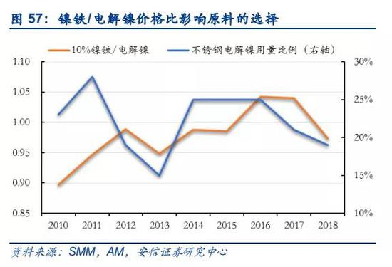 对于红土镍矿-不锈钢路径来说,对镍板的需求变化极易导致电解镍供需的局部失衡。不锈钢生产商采用镍板的主要原因一是用来调整钢水中镍的含量,保证生产工艺顺利进行;二是通过镍板与镍铁之间的价格平衡调控用量,降低不锈钢的生产成本。目前由于不锈钢镍原料中镍镍铁和镍板之间可以相互替代,国内镍板的用量维持在15%-30%之间浮动,一旦价格合适,不锈钢厂将倾向于利用价格更低的原料。考虑目前全球不锈钢用镍总量处于150万吨左右的水平,按镍板用量15%-30%的波动比例计算,镍板的用量波动约在20万吨量级,占镍总需求近10%,占硫化镍矿生产精炼镍总量近30%,短期的替代将必将带来电解镍市场的供需失衡,导致镍价振幅较大。