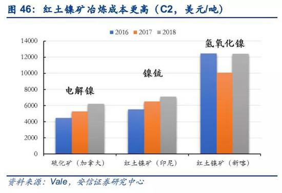 红土镍矿湿法冶炼项目由于技术复杂性,投产周期长,成本较高。全球镍中间产品原料主要来自红土镍矿及伴生镍矿,2018年镍中间产品产量约29.7万吨(金属量),同比下降9%,从近4年产量情况来看,整体呈现下降趋势。镍中间产品中有潜力扩张的部分是来自红土镍矿的供应,目前红土镍矿湿法冶炼工艺主要有三种,一是还原焙烧-氨浸工艺,最早在古巴尼加罗冶炼厂得到应用,随后印度苏金达厂、菲律宾诺诺克镍厂、澳大利亚亚布鲁冶炼厂等相继采用此工艺;二是硫酸常压浸出工艺,主要是国内云锡元江镍业、广西银亿等公司采用此方法;三是加压浸出工艺(HPAL),最早应用于古巴毛阿镍厂,后来在澳大利亚、巴西等地方均有建厂,近二十年全球新建的红土镍矿湿法冶炼厂主要采用此工艺,如马达加斯加的Ambabovy项目,新喀的Goro等等,中国中冶集团在巴新Ramu冶炼厂采用此工艺生产,该项目2015年达产,投资超过20亿美元。此类工艺的特点一是初始投资大,每万吨的投资在5-9亿美金。二是建设周期较长,由于地处非发达国家,基础设施条件较差,投产延迟较多,例如Ambabovy项目、Goro项目以及Ramu项目的投产延迟分别达到2年、6年和3年之久,一般企业较难承受,无法大规模快速扩张。三是运行成本更高,淡水河谷公司拥有硫化镍矿和红土镍矿两类冶炼厂,2016-2018年全年运行成本对比来看,红土镍矿显著高于硫化镍矿的冶炼成本。