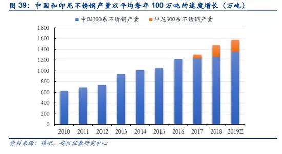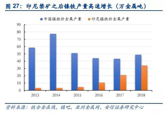 中国和印尼镍铁产量持续增长。我国镍铁产量在受到印尼第一次禁矿后由于原料的短缺导致镍铁产量出现下滑,但随着禁矿有条件放开,国内镍铁产量重回增长趋势,2018年国内镍铁产量约48.8万吨,同比增长13%。印尼则受到禁矿影响,国内镍铁产量呈指数增长态势,2018年镍铁产量约34万吨,同比增长62%。