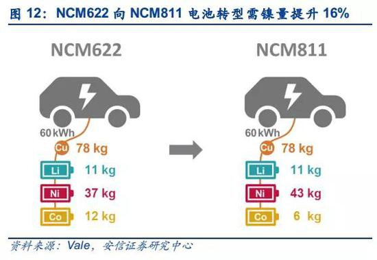 我们认为,未来电动汽车对硫酸镍的需求有望持续对镍价形成边际拉动。一是全球电动汽车的增长较快,有望持续维持40%-50%的增速,叠加单车带电量提升以及电动汽车三元电池材料高镍化的持续推进,渗透率逐步提高,2019-2020年年均镍需求增长有望接近60%,大幅超过电动汽车增速,据我们测算,到2021年对应镍总需求比例有望达到9%。