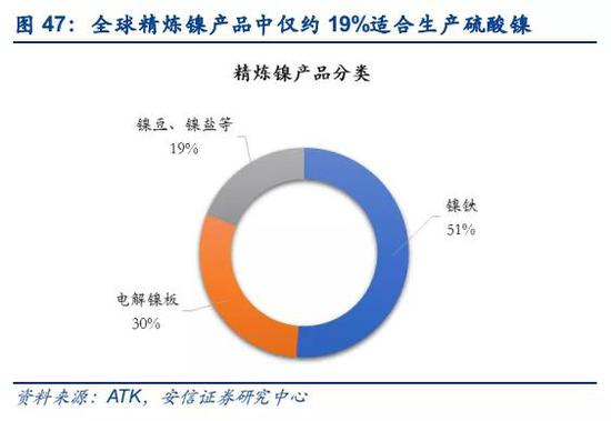 ■新能源汽车三元动力电池有望成为未来镍需求最大增长点。全球汽车电动化已经成为未来发展趋势,据EV-VOLUMES数据显示,2018年,全球电动汽车保有量达540万辆,比2017年增长64%,预计2019年纯电动汽车的销售占比为69%,全球电动汽车保有量将达到850万辆。2018年全球三元动力电池硫酸镍需求达到6万吨,叠加单车带电量提升以及高镍三元动力电池渗透率提高,据我们测算,到2021年镍需求有望达到24万吨,2019-2021年CAGR将近60%,超过新能源汽车增速,未来有望成为仅次于不锈钢的第二大镍消费领域。