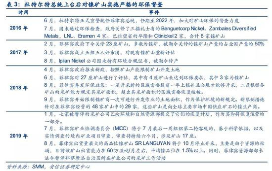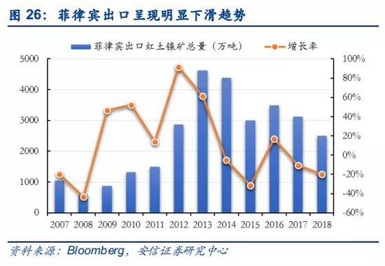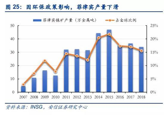 菲律宾是目前全球第一大镍矿生产国,受菲国内环保影响,近三年产量出现下滑。印尼和菲律宾是全球排名第一和第二的红土镍矿生产国,受印尼禁矿的影响,菲律宾2014年后替代印尼成为全球最大的镍矿生产国,也成为我国镍矿主要进口国,占比一度超过95%。2015年顶峰时期,菲律宾镍矿产量约为47万吨,占全球比例达到22%。2016年6月菲律宾总统上台后,开始大抓国内采矿业秩序,要求实行更严格的环保规定,造成镍矿产量回落,2016-2018年产量分别约为35、37和34万吨,相对于2015年减少约25%左右。