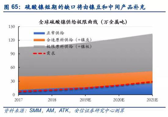 考虑全球硫酸镍各行业需求增速,我们预计2019-2021年全球硫酸镍(实物量)需求量分别为66万吨、93万吨和130万吨,在动力三元锂电池的带动下,需求呈持续扩大的趋势。