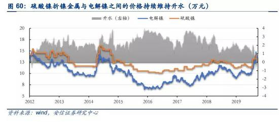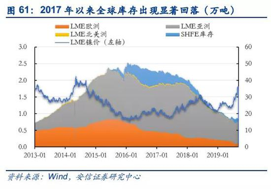 新能源汽车对硫酸镍的需求提升,导致全球库存快速下降,长期来看有望拉动镍价上涨。硫酸镍前期对金属镍维持升水的主要归因于加工成本,海外大部分硫酸镍生产厂利用镍豆或者镍粉溶解的工艺生产,据上海有色网数据显示,生产成本大概在1万元左右,而2016年以来,溢价达超过3万元,并一直维持在2万以上,表明当前硫酸镍的需求旺盛,并且从库存可以看到,2017年开始全球镍库存开始从最高位持续下降,并在2018年出现急剧下滑,侧面说明了市场对硫酸镍的大量需求。