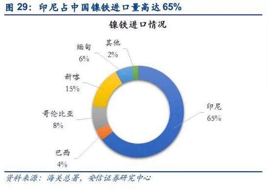 禁矿政策迫使中国镍铁产能向印尼转移,镍矿出口大国转变成镍铁出口大国。2014年以前印尼当地镍铁产能仅3万吨左右,镍矿基本全部出口,中国由于对红土镍矿的短缺,使得很多国内的不锈钢企业瞄准了印尼,直到2014年印尼政府原矿出口禁令颁布,更加速了中国不锈钢企业抢占不锈钢原料印尼镍铁市场的步伐,积极在印尼建立镍铁冶炼厂,以满足中国不锈钢行业日益增长的镍铁需求。从产量数据来看,印尼镍铁产量迅猛增长,年均复合增长率达到80%。中国从印尼的镍原料进口也从红土镍矿转变成镍铁,使得印尼迅速成为中国最大的镍铁进口来源国,2018年印尼占中国镍铁进口量比例达到65%。目前由于印尼再一次实施禁矿,印尼镍铁产能建设与释放有望加速,预计未来镍铁产能有望持续放量。