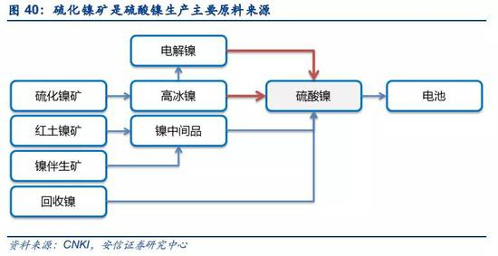 动力电池对硫酸镍的需求有望加剧硫化镍矿供应紧张。新能源车动力电池三元材料以硫酸镍为原料,而硫酸镍生产的原料主要来自硫化镍矿,常见的硫酸镍生产工艺是通过硫化镍矿火法冶炼生产高冰镍再采用湿法工艺生产硫酸镍,或者生产电解镍后再通过酸溶生产硫酸镍,其他原料主要来自红土镍矿(HPAL工艺)、镍伴生矿和回收镍三个来源。其中,以电解镍为原料生产的硫酸镍纯度和品质最好,国外多采用此工艺,国内采用高冰镍及镍中间产品生产硫酸镍居多,成本相对便宜。电动汽车产业的崛起打破硫化镍矿的供应平衡,一度引起供应抽紧,目前大部分镍生产商开始将目光投向电动汽车用镍的原料端硫酸镍产业。