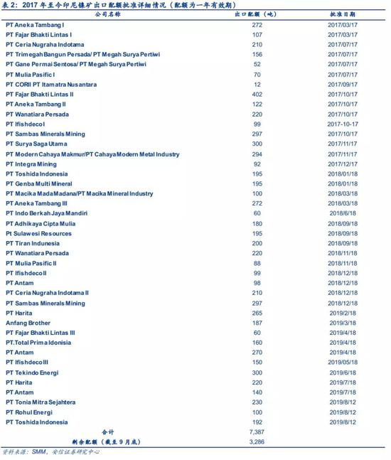 印尼禁矿后,年内出口有望加快,但受配额和运力影响出口大幅放量较难。据SMM数据显示,自2017年1月出口政策修改后,截止到2019年8月,印尼累积下发镍矿出口配额达约7,387万吨,剩余配额约3,861万吨。前期,我们看到尽管印尼有条件放开镍矿出口,实行配额制度,允许镍品位1.7%以下的镍矿出口,但实际已审批的配额完成度较低,主要由于镍铁冶炼厂完成度低于政策要求,出口配额经常被停止,同时由于运力有限,尽管需求加大,但出口大幅放量的可能性较低。