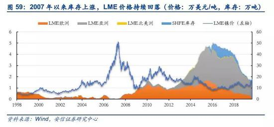 硫化镍矿目前主要用于传统的镍需求领域,需求的减弱导致库存上涨近十年。硫化镍矿生产工艺成熟,已经有100多年历史,通过火法生成高冰镍之后分成两路,一部分做成电解镍,另一部分做成镍盐。从硫化镍矿供应格局来看,在红土矿大规模应用之后,供应领域从硫化矿供应所有镍的应用领域转换到仅供应传统的合金、电镀和电池领域,导致电解镍开始过剩,从2007年全球近乎0吨的库存,持续累库,到2016年最高点达到约50万吨,持续压制镍价。