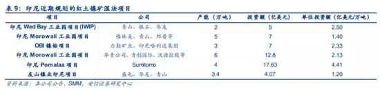 部分红土镍矿通过湿法途径制备成镍中间产品进入到硫酸镍领域,因为技术与成本瓶颈,近年来并无增量,但随着技术的突破以及对未来需求的预期,印尼湿法项目开始密集布局。红土镍矿由于其丰富的资源,采用火法或者湿法工艺生产镍中间产品一直是全球研究的热点,自2007年以后镍需求以及价格上涨后,红土镍矿生产镍盐的动力再次提升,目前运行最顺利的是我国中冶集团在巴布亚新几内亚的Ramu项目,采用的加压浸出工艺(HPAL),目前全部已达产。但是对于大多数项目,由于氧化矿的形式以及杂质较多造成生产工艺前期投资较高、流程冗长、回收率低、产品质量较差等因素,导致近年来并未有大规模增量,反而因为镍价下跌部分冶炼厂进行了关停。而印尼近两年以国内青山、华友、盛屯、格林美等一批企业密集布局湿法项目,一方面表明对未来镍需求的乐观,另一方面技术的进步也让投资成本显著下降,单万吨投资成本降至2.5万美元/吨以下,大幅低于前期5万美元/吨的投资额。