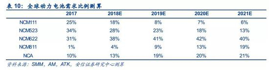 考虑未来动力三元锂电池的发展趋势有望向高比容量的电池类型发展,对于动力电池不同三元材料的比例我们给出全球三元动力电池NCM811的渗透率在2019-2021年分别给予9%、13%和19%的预测