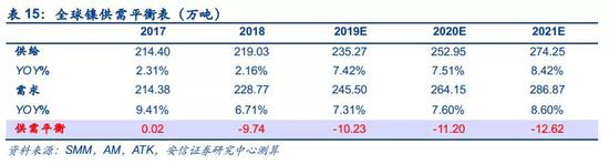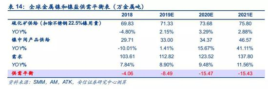 其次,从非镍铁需求的金属镍和镍盐供需平衡来看,由于硫化镍矿衰退性供给收缩,硫化镍矿的供给早已不能完全满足金属镍和镍盐的下游需求,目前一直依靠红土镍矿生产的镍中间产品维持供需平衡,考虑到红土镍矿生产镍中间产品建设周期长、技术复杂,印尼湿法镍项目投产大部分都在2021年前后,随着金属镍和镍盐领域的需求增长,未来供需缺口有望持续拉大。