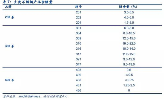 300系不锈钢含镍量在6%-22%之间,是含镍量最高的不锈钢主力品种,产量占比超过50%。在不锈钢分类中,200系、300系、400系不锈钢是最常用的三个系列,分类主要根据含镍量的差异来区分,200系是镍铬锰系不锈钢含镍量较低,一般在1.5%-6%之间,300系是镍铬系不锈钢含镍量最高,一般在6%-22%之间,400系是铁素体不锈钢含镍量最低,一般在2.5%以下,并且部分品种不含有镍元素。中国生产的不锈钢中超过50%的产量都是300系,300系也是防锈效果最好的不锈钢系列。