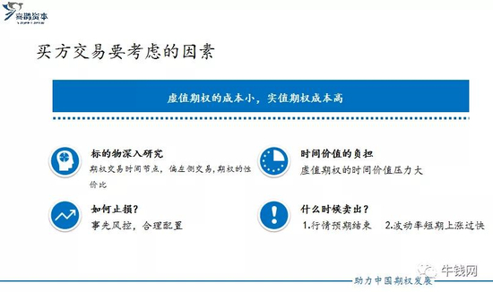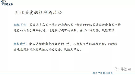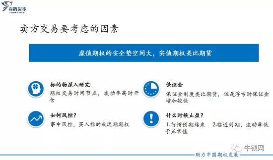 但期权的卖方确实不一样,它的权利和义务是对等的,但期权的卖方我们也听到很多报道,说很多机构做期权都做爆仓了,是不是风险巨大?其实并不是狼来了,卖方的杠杆要小于期货,因为在国内特别是50ETF,期权的卖方,杠杆只有六七倍,白糖期权卖方的杠杆也是低于十倍。现在期货品种保证金只要5%,杠杆都达到20倍,所以说期权的杠杆性并不高。为什么会出问题?主要是我们的仓位没有控制好,如果我们控制好适当的仓位,做相应期权的卖方,它比期货来得更安全。因为我卖的是虚值期权,我卖的是更高行权价,我还收到一笔权利金,我拥有两道安全垫,比纯粹直接做期货更安全。但是如果你仓位过大,你也不知道它对应的市值到底有多大,那确实有风险。因为万一趋势错了(因为卖的虚值)它对应的市值如果一旦靠近平值期权,它的上涨确实很恐怖。