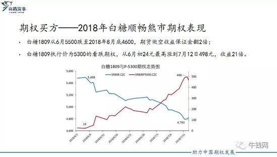 你们看,如果一波趋势出现,期权的收益是巨大的,特别是在1809合约上,1809当时从6月份的5500点跌到了2018年8月份的这个4600点,其实也就跌了900个点,对不对?如果我们做期货的话,我们的保证金收益大概就是两倍。但是期权的话,比如5500的时候你买个5300的看跌期权,这个时候也不是说很虚的期权对不对?也是一个正常合理的一个行权价格,那你收益至少在21倍。再加上白糖期权的波动率也不高,所以如果白糖未来有一个真的超过500点的行情的话,期权的收益是很大的。但问题是能不能把握得了这个行情太关键了,这个并不是每个人都可以把握的了的。其实期权它只是个工具,我们应该要把所有的时间精力花在对白糖的研究上,比如你对股票的研究,对股指未来的预判上。