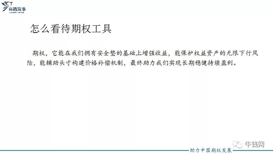 我们应该怎么看待期权这个工具?首先它只是个工具,它一定是为我们做投资、做交易来服务的。那么它这个工具有什么作用?它是在我们拥有安全垫的基础上来增强我们的收益。还有就是它能够保护我们权益资产的无限下行的风险。然后它还可以辅助我们的交易,构建价格补偿系统,最终助力我们的交易实现长期的稳定的盈利。所以很多人用期权工具,用的只是它一点点的杠杆,用它的以小博大,其实它还有保护的功能。